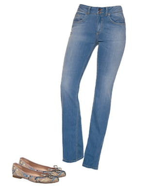 Voici un jean de coupe classique, avec une taille pas trop basse et une forme légèrement évasée dans le bas. On lui associe des ballerines arty, comme cette paire signée Longchamp, dont certains traits de couleurs rappellent le bleu ciel du denim. Le souci du détail !