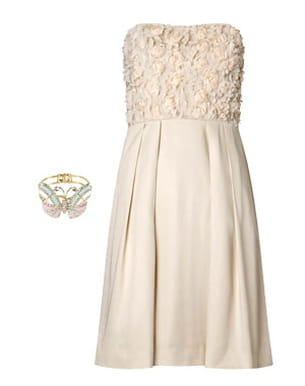 Pour sacrer le printemps et l'arrivée des beaux jours, on joue les jeunes filles en fleurs avec cette robe Mango. Romantique à souhait, elle affiche une forme bustier et fait fleurir des roses sur ce dernier. pour rester dans l'esprit bucolique, on enfile un bracelet aux délicats coloris pastel. Une tenue  parfaite pour un mariage ou pour une garden-party.