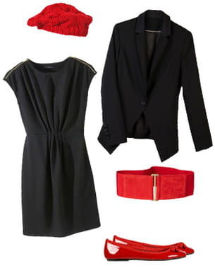 Pour jouer les coquettes, on mise sur un look rouge et noir. La petite robe s'habille d'une veste que l'on pourra ceinturer avec une large ceinture. Le coloris rouge de cette dernière viendra créer le contraste tout comme les ballerines vernies et le béret pour un petit look fidèle à l'élégance française. Une silhouette parfaite pour aller travailler ou encore aller déjeuner avec ses copines.