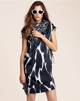 Avis aux amatrices de tenues imprimées ! On aime toute l'originalité de cette robe signée Sinequanone en noir et écru, avec se ligne structurée et ses épaulettes à l'encolure croisée. Ultra tendance.