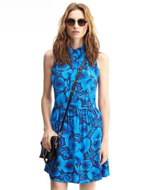 L'avantage avec le bleu, c'est qu'il s'accorde aussi bien avec le ciel qu'avec la mer. Sur cette petite robe, il se décline du bleu encre au bleu turquoise sur de jolies fleurs d'hibiscus. Avec sa coupe style chemise en haut et jupe simplette en bas, on croirait même à un ensemble en trompe-l'œil.