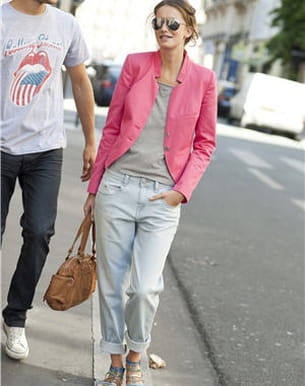 Il est plus que temps d'adopter le mode denim version boyfriend retroussé, et avec l'arrivée des beaux jours voilà un modèle particulièrement conseillé. On joue la carte du masculin-féminin tout en douceur avec ce jean très délavé ! Collection printemps-été 2011