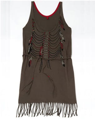 Les franges restent nos alliées pour aborder le printemps! Et pour adopter un look à la Pocahontas, on opte d'urgence pour cette tunique où les motifs et les plumes font explicitement référence aux Indiens.