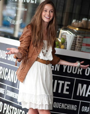 Pour prendre sa pause café en étant le plus à l'aise possible dans vos vêtements, rendez-vous chez Camaïeu. La marque vous propose une petite robe blanche à volants cintrée à la taille par une ceinture en cuir camel. Et, pour donner un côté cowboy à votre allure, enfilez un blouson en cuir couleur café au lait. Vous serez tout à fait dans le ton pour ce moment de gourmandise à deux !