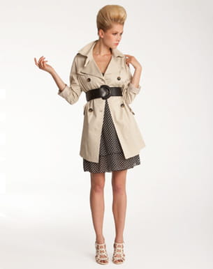 Si l'envie vous prend d'aller voir une pièce de théâtre, voici l'allure idéale : un trench couleur crème avec une grosse ceinture noire marquant délicatement la taille. Et la robe à bretelles dos nu n'est pas en reste : noire à pois blancs, avec ses petits volants. Chut, les trois coups vont bientôt retentir !