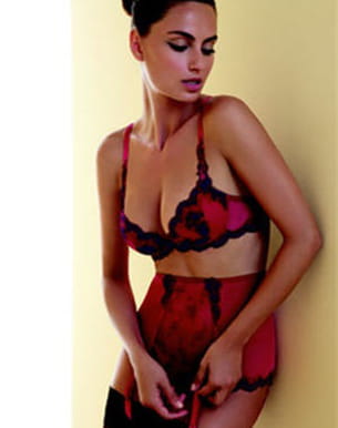 Une parure d'une hyperféminité pour une séduction extrême. Lise Charmel se fait envoûtante et nous rend unique avec cet ensemble rouge. La culotte se porte haute, comme le veut la tendance rétro qui remet au goût du jour le chic des années 1950. Voici balconnet, taille haute et porte-jarretelles pour être sexy et fatale ! Collection printemps-été 2011