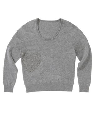 On adopte ce pull chic 100% cachemire gris et tout doux. Une touche de fantaisie glamour est apportée par le cœur en strass ton sur ton dessiné sur le côté.