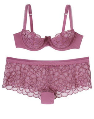 La ligne "Lou Code" propose un ensemble de lingerie en broderie sur tulle mixant fils mats et brillants. On craque pour cette couleur framboise parfaite pour passer la nuit de la Saint-Valentin en amoureux.