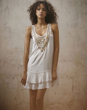 Quel meilleur moment pour se vêtir tout en blanc que la saison estivale ? Une couleur qui assure fraîcheur et élégance à toutes celles qui l'optent. Deby Debo l'a bien compris et propose une robe à volants dont les motifs du décolleté donnent l'illusion d'une robe ethnique. Ça tombe bien, ce style est à la pointe de la mode ! Oui mais attention, en elle n'en oublie pas d'être chic ! Les motifs dorés apportent une petite touche de luxe qui dynamise la tenue. A compléter par des spartiates dans les mêmes tons pour encore plus de classe. Collection printemps-été 2011