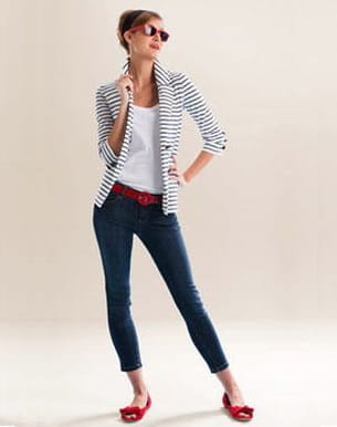On aime l'esprit fashion et un peu rétro de cette tenue. Avec sa veste aux rayures marines et son jean, elle offre un joli compromis entre le côté habillé et le style fashion un peu cool. La ceinture et les chaussures apportent une petite note de couleur des plus sympathiques. Mais n'oubliez pas d'enlever les lunettes de soleil avant de franchir la porte !