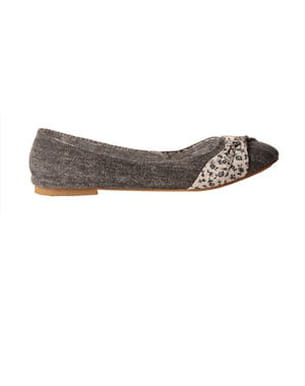 En jean gris, ces ballerines fleurent bon le printemps. On aime le détail qui vient s'ajouter sur le dessus de la chaussure pour rester tendance, même en ballerines toutes simplse. Ce gros nœud se pare de motifs dans l'esprit Liberty dans les tons gris-bleus. A croquer ! Collection printemps-été 2011