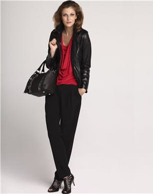 Parfait ce petit look à la fois chic et branché ! Le pantalon coupe carotte reste un indispensable à notre garde-robe de la rentrée. On le porte avec tout et en toute circonstance, la preuve avec ce top rouge glamour agrémenté d'un perfecto pour la touche un peu rock qui nous va si bien !