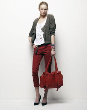 Ultra-tendance, cette tenue signée Bash joue la nuance des couleurs entre le rouge sang et le gris chiné de la veste en daim. Pour un accord parfait avec le pantacourt qui affine la cheville, n'hésitez pas à l'associer avec un it-bag de la même couleur. Avec ce style sans fausse note, vos copines seront "rouges" d'envie...
