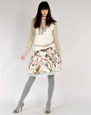 Un esprit printanier pour cet ensemble signé Essentiel. On aime l'association de la jupe en mousseline joliment imprimée avec le jupon tulle pour le petit côté romantique. Du rose, du gris et du camel pour la petite touche de fraîcheur des plus agréables. Une tenue douce et harmonieuse agrémentée de collants et d'une ceinture en cuir gris clair pour finement rappeler les motifs de la jupe...