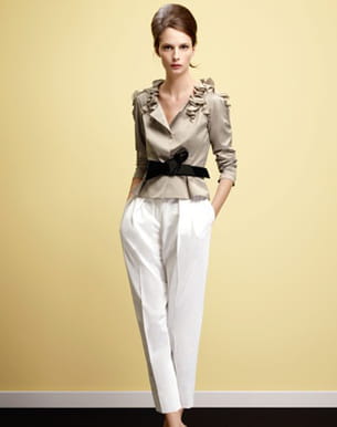 Comme à chaque saison, les collections de Paule Ka nous enchantent. Pour les beaux jours, on jette notre dévolu sur cet ensemble composé d'un pantalon large en popeline satinée et d'une petite veste aux détails crêpe georgette. Pour toujours plus d'élégance, on ne manquera pas de marquer la taille d'une ceinture nœud en cuir vernis mat. Un ensemble Paule Ka, une valeur sûre. Collection printemps-été 2011