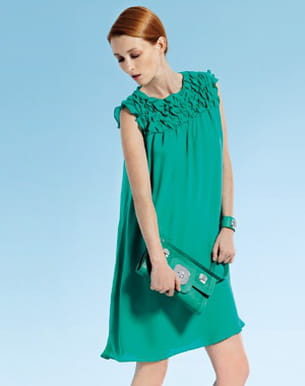 Un petit vent de fraîcheur souffle sur la nouvelle collection printemps-été de Longchamp. Et pour être chic et élégante en toute circonstance, on jette tout naturellement notre dévolu sur cette robe verte en soie, dotée de détails romantiques à l'encolure. Succès garanti !  Collection printemps-été 2011