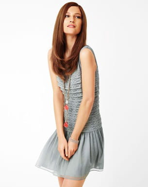 Cap sur les années folles avec ce modèle au délicat bleu. Très romantique, cette robe taille basse joue sur les volants de son haut et la fluidité du voile de sa jupe pour nous offrir une allure très rétro. L'occasion pour nous de jouer cette carte à fond avec un joli sautoir et pourquoi pas, des babies dans le même esprit. Collection printemps-été 2011