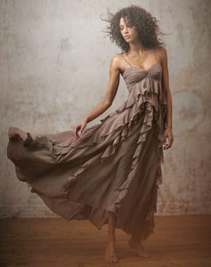 Deby Debo fait sensation avec sa maxi-dress qui apporte une incroyable touche de romantisme. Du drapé qui met en valeur toutes les poitrines à la chute de froufrous jusqu'aux chevilles, en passant par la jolie couleur taupe, rien n'est laissé au hasard. Que demander de plus ?Collection printemps-été 2011
