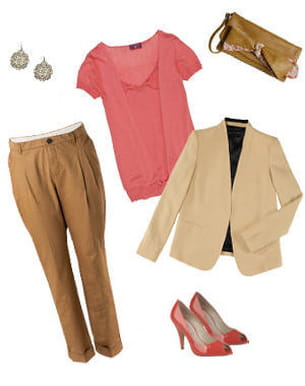 Les beaux jours reviennent, on se concocte un petit look qui fleure bon le printemps ! Pour cela, rien de tel que de mixer les pièces tendance de la saison à savoir un pantalon chino à rehausser d'un top corail. Il n'y a plus qu'à associer les bons accessoires pour être au top : escarpins corail eux aussi et à l'effet glossy, mais aussi pochette camel - comme le pantalon - et dotée de motifs Liberty de rigueur. Et voilà, le tour est joué !