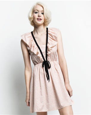 Naf Naf garde son secret pour créer chaque saison des robes à faire craquer les fashionistas ! Pour le printemps, on jette notre dévolu sur ce modèle rétro-romantique à volants, sublimé de légers motifs et d'un profond col V en trompe-l'œil. Un ruban noir vient se nouer sur le devant pour une touche de glamour supplémentaire. Trop belle ! Collection printemps-été 2011