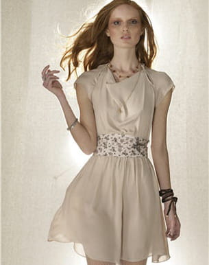 Pour les beaux jours, Cop.Copine mise sur une robe effet double peau, toute légère et fluide que l'on ne voudra plus quitter. On aime aussi le gros ruban fleuri retenu par une broche hirondelle qui vient ceinturer marquer la taille avec délicatesse. Collection printemps-été 2011