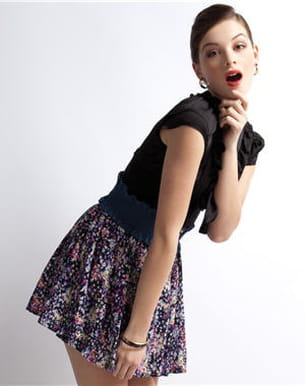 Oh la jolie mini-jupe ! Comment ne pas se laisse tenter par ce modèle baby doll qui se pare d'un bouquet de fleurs ? Dans les tons mauves, les motifs esprit Liberty apporte un souffle de fraîcheur et de candeur à faire craquer ! Collection printemps-été 2011