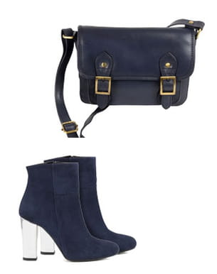 Comment booster une besace un peu trop sage ? En lui associant des boots au talon brillant. On aime le coloris bleu nuit de ces deux accessoires qui offre une alternative au trop attendu noir !