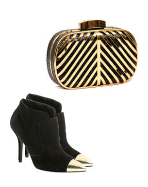 Pas envie de vous habiller pour aller en soirée ? Pas de panique, il suffit parfois simplement de booster son jean et son top noir à l'aide des bons accessoires. La minaudière est parfaite pour glisser clés, portable et gloss tandis que les boots à bout pointu et doré sont incontournables cette saison !