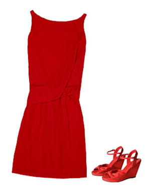 Rouge glamour, rouge toujours ! Voilà une valeur sûre côté tenue chic : la jolie robe rouge fera toujours son effet. Ce modèle de Zara nous séduit avec le haut près du corps et le bas légèrement évasé. Quant aux chaussures, ces sandales compensées d'Etam lui collent parfaitement. Un look parfait !