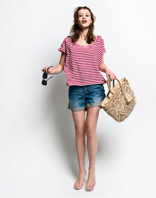 Il fait beau, on a envie de sable chaud, de coquillages et de crustacés sur une plage abandonnée... Allez hop, on embarque pour une virée en bord de mer. Bien sûr, la marinière s'impose. On la choisit rouge pour une touche d'originalité et de couleur. Pour le reste de la tenue, on mise sur un short en jean à revers et sur un panier en osier. Et bien sûr, on n'oublie pas les lunettes de soleil. car même à la plage, on se la joue 100 % VIP !