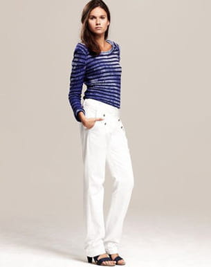 Le blanc est à l'honneur cette saison pour contrecarrer la déferlante des vêtements color block. Et ça fait du bien ! IKKS donne un petit look marin à son pantalon avec les gros boutons qui se positionnent sur le devant. Parfait pour une ballade les soirs d'été ! Collection printemps-été 2011