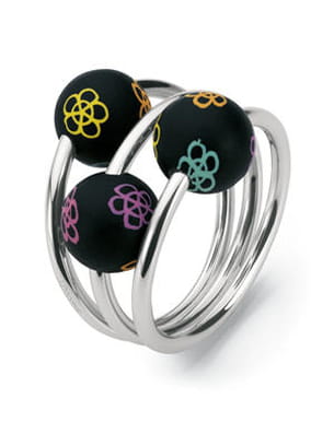 Vous êtes en quête d'originalité ? Vous serez servie avec la nouvelle collection de Swatch Bijoux. Entre fleurs multicolores, pampilles et autres formes asymétriques, découvrez la ligne "Pallabella" dont fait partie cette bague en acier et argile de polymère noire. On remarque bien entendu les jolis dessins de fleurs colorées sur chaque petite boule pour toujours plus de gaieté et de fantaisie.