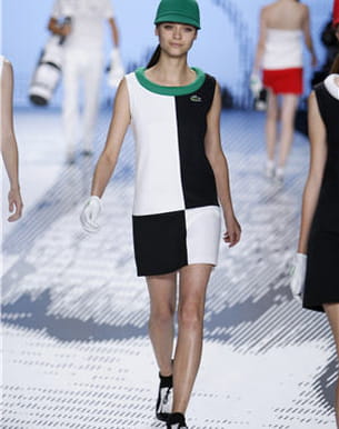 Fraîche, jeune, sportswear, chic, tels sont les maîtres mots pour qualifier la nouvelle collection printemps-été de la célèbre marque au crocodile. Entre tenues élégantes pour la ville et jupettes plus décontractées, couleurs flashy ou teintes plus naturelles, Christophe Lemaire, le directeur artistique de Lacoste, a pensé à tous les styles. Vous aimez l'influence pop sixties ?  Voilà une robe qui devrait vous combler pour cet été. Façon damier noir et blanc, elle est originalement agrémentée d'un col rond couleur chlorophille pour la petite note de fraîcheur des plus agréables. Et on n'oublie surtout pas la casquette cavalière assortie !