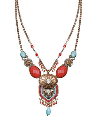 Voici un bijou original et haut en couleur qui invite à l'évasion... On apprécie particulièrement l'alliance des coloris rouge et turquoise des plus surprenantes qui égaie à merveille ce bijou en métal cuivré. Un collier signé Satellite qui habillera à lui seul votre tenue.