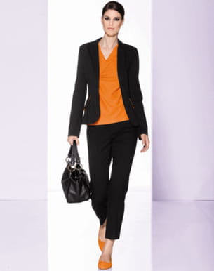 La marque de ce tailleur porte bien son nom : il nous assure une élégance parfaite pour un rendez-vous professionnel. Rien de tel qu'un tailleur pantalon à la couleur noire très chic, pour mettre toutes les chances de son côté et décrocher le contrat de sa vie ! Le pantalon adopte la coupe 7/8ème idéale pour la saison printanière et on fait confiance à la tendance color block pour égayer un ensemble sombre avec un top orange assorti aux ballerines. Chic et pop !
