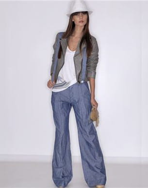 Bretelles, toile ultra fine, jambes larges : ce jean a tout pour plaire. Sans oublier son tissu d'un joli bleu aux effets légèrement moirés. Un joli modèle.