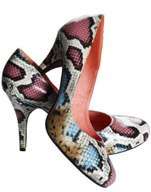 Du rose et du turquoise sur un fond façon python, voilà des escarpins qui ne manquent pas d'originalité ! C'est sûr, les modeuses les auront toutes aux pieds cette saison. Et les plus fans opteront même pour la pochette assortie pour un total look garanti !