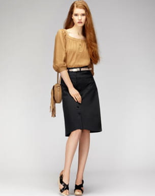 Avec Gérard Darel, on aborde la journée de travail tout en douceur et en beauté ! Pour le bas, on mise donc sur une jupe mi-longue en coton noir munie de gros boutons sur le devant. Et pour le haut, la petite blouse camel dans l'air du temps est de rigueur ! Au pied, rien de tel que des sandales ouvertes et compensées pour faire sensation tout en était chic et à l'aise.
