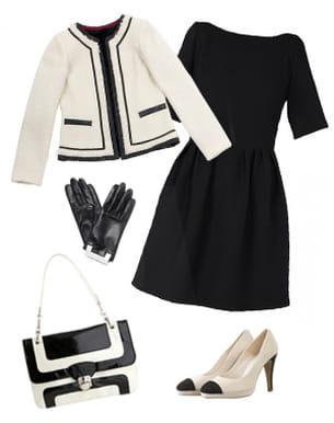 Coco Chanel n'a pas créé qu'une marque, elle a inventé un style. Avec ce look, on reprend les codes de Mademoiselle Gabrielle : du noir et blanc, une veste en tweed et un petit sac à main. On le modernise simplement avec des gants et un esprit un peu plus art-déco. Une manière de lui rendre hommage tout en imposant notre propre personnalité. Nous aussi on peut se créer un style !