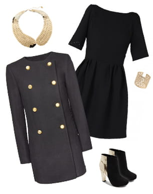 L'alliance du noir et du doré peut faire des étincelles. La petite robe noire devient presque un bijou entouré de ce collier et ce bracelet aux reflets d'or. Un détail que l'on retrouve avec discrétion sur les boutons du manteau officier et sur l'arrière des bottines. Ni trop habillé, ni trop casual, c'est le look impeccable pour enchaîner journée de boulot et soirée entre copines ou en tête à tête avec Jules.