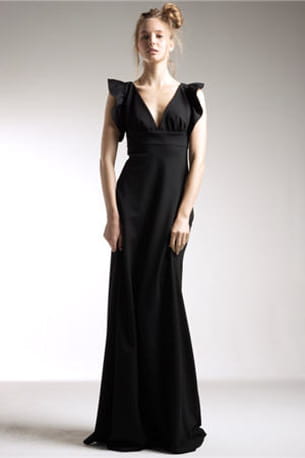 Delphine Manivet est la créatrice du moment. Demandez-lui une robe de mariée ou une robe noire et elle vous fait une petite merveille. Une pièce qu'on n'aurait pas imaginée, même en rêve. Cette robe longue jusqu'aux pieds est un exemple parmi les autres. On aime tout particulièrement le décolleté et les épaules. Et puis, dans le dos, une jolie découpe partage la vedette avec un nœud. On adore.