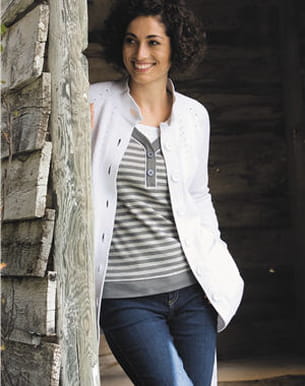 Voilà une tenue décontractée et mode à la fois, à porter en toute simplicité. Le grand basique jean se marie ici harmonieusement avec un top en coton rayé blanc et gris agrémenté de deux jolis boutons. Les vents se rebellent ? Il n'y a plus qu'à enfiler ce ravissant gilet blanc, parfait en période estivale, et suffisamment long pour dissimuler nos rondeurs. Quelques essentiels à adopter sans hésiter.