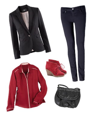 Même si votre compte en banque n'est pas au beau fixe, il est possible d'être à la pointe de la mode ! Au travail ou en soirée, cet ensemble veste, chemise, jean, compensées et sac s'adapte à toutes les situations. Son plus : ses pièces sont des basiques à avoir dans sa garde-robe. Alors aucun doute, ce look en rouge et noir vous redonnera le sourire en période de crise !