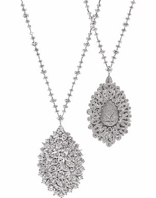 Toute l'expertise et le savoir-faire du grand joaillier s'exprime à travers cette création signée Harry Winston. Il s'agit d'une montre pendentif qui renoue avec la mode des années 1930 et qui peut être portée côté pile ou côté face, avec le cadran visible. Un véritable bijou, en platine avec 57 carats de diamants.