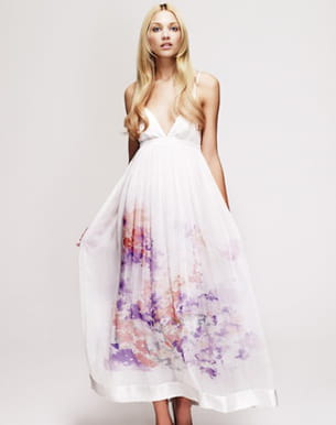 Tout en longueur, cette robe blanche d'une extrême douceur se pare aussi de jolies fleurs et de satin. Romantique et chic, elle s'inscrit plus que jamais dans la tendance de l'été. Un best à adopter !  Collection printemps-été 2011