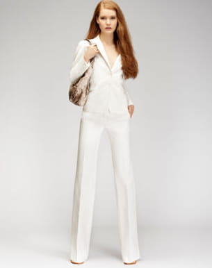 Le tailleur pantalon blanc, les sandales et le sac de Gérard Darel