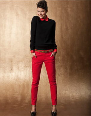 De la couleur encore et toujours avec ce slim rouge de La Redoute ! On craque pour son allure punchy mais aussi pour son petit côté rock grâce aux zips au bas des jambes et au niveau des poches, et ses découpes aux genoux. Must have ! Collection automne-hiver 2011-2012