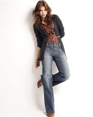 Cette saison, on aime particulièrement les coupes évasées au rayon denim. C'est donc tout naturellement qu'on se laisse tenter par ce modèle légèrement délavé et parfait pour allonger la silhouette. Collection automne-hiver 2011-2012