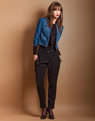 Tendance et original, cet ensemble est parfait pour aller travailler. Il allie le caractère élégant du pantalon et du top noirs au chic décontracté de la veste en jean. Un duo qui sort du lot et qui offre une réelle alternative au traditionnel tailleur. On n'hésite pas à jouer sur un haut travaillé pour se faire remarquer.