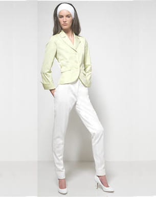 Coupes impeccables, belle qualité de finition, matières nobles et coloris subtils, voilà ce que vous propose Bernard Zins au cœur de ses collections. En atteste cet ensemble vert anis et blanc, mélangeant veste cintrée chic et pantalon coupe cigarette et taille haute tendance. Du style.